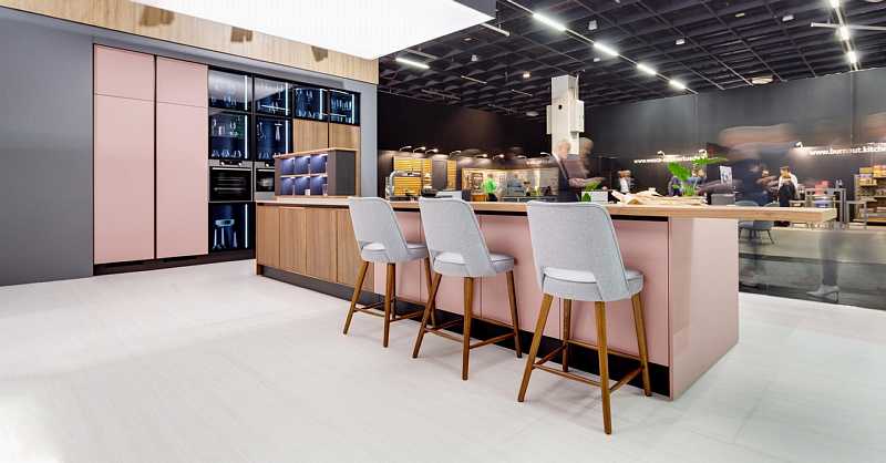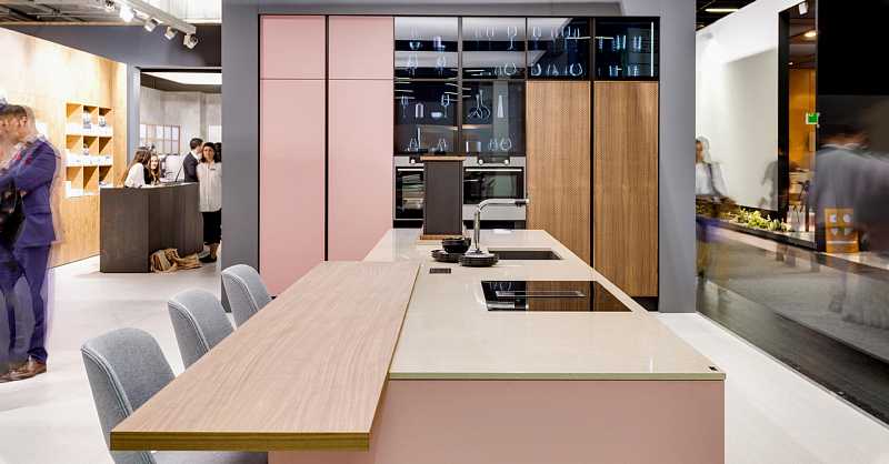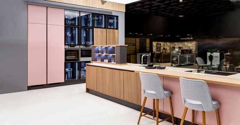 Необычное тиснение на шпоне натурального американского ореха дополнено пепельно-розовыми дверьми с матовой поверхностью, что придает кухне эксклюзивность. Стильная рамка COUTURE покрыта прозрачным лаком с эффектом неокрашенной древесины.