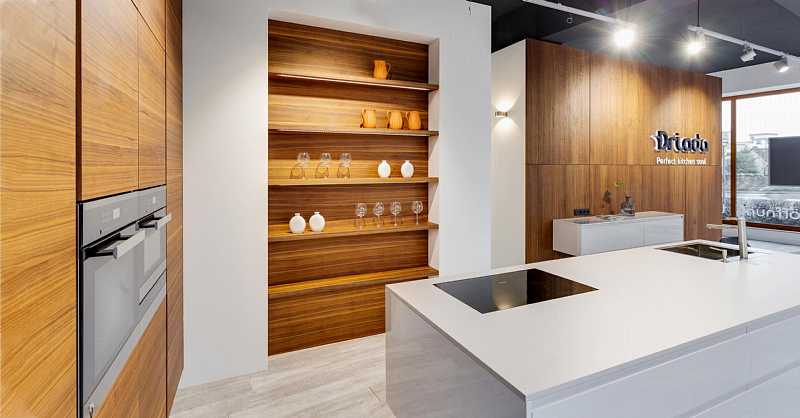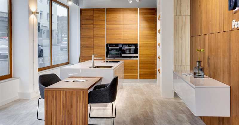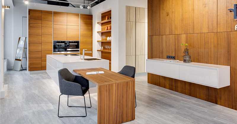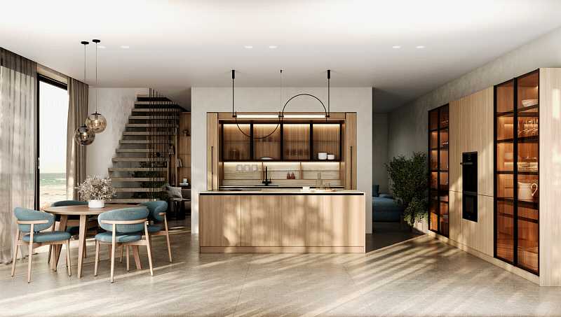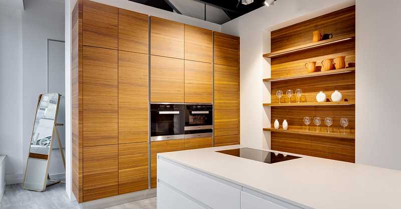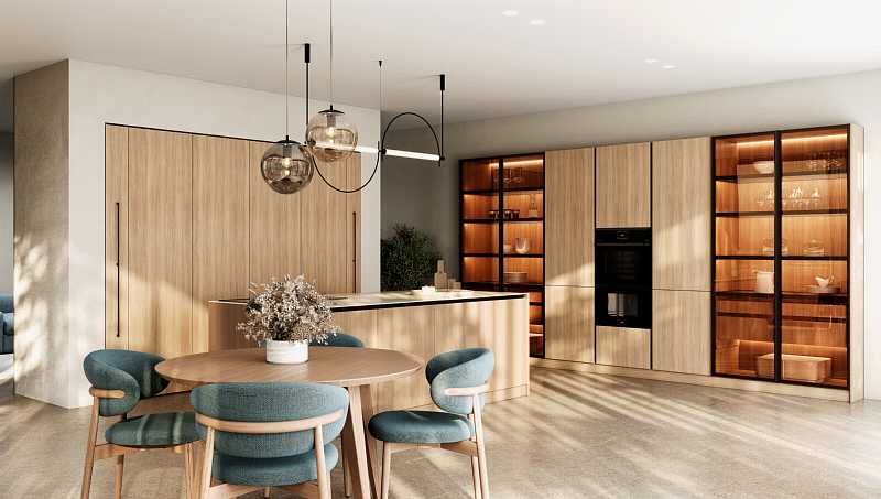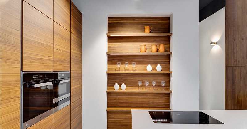 Шпон эвкалипта под бархатистым матовым лаком, тонированный морилкой подчеркивает благородность и естественность. Наличие скрытых выдвижных фасадов позволяет наслаждаться красотой природного рисунка, не отвлекаясь на детали.