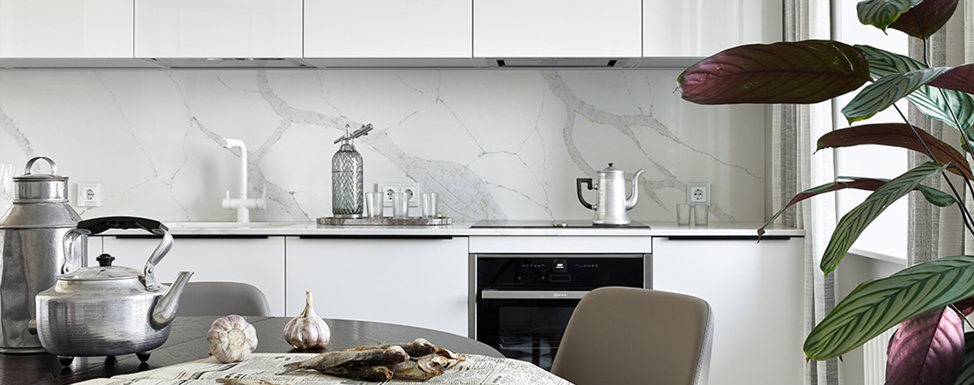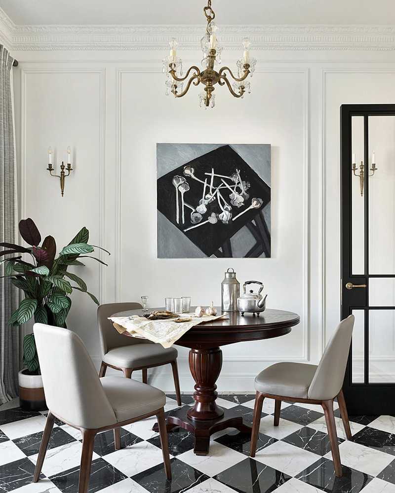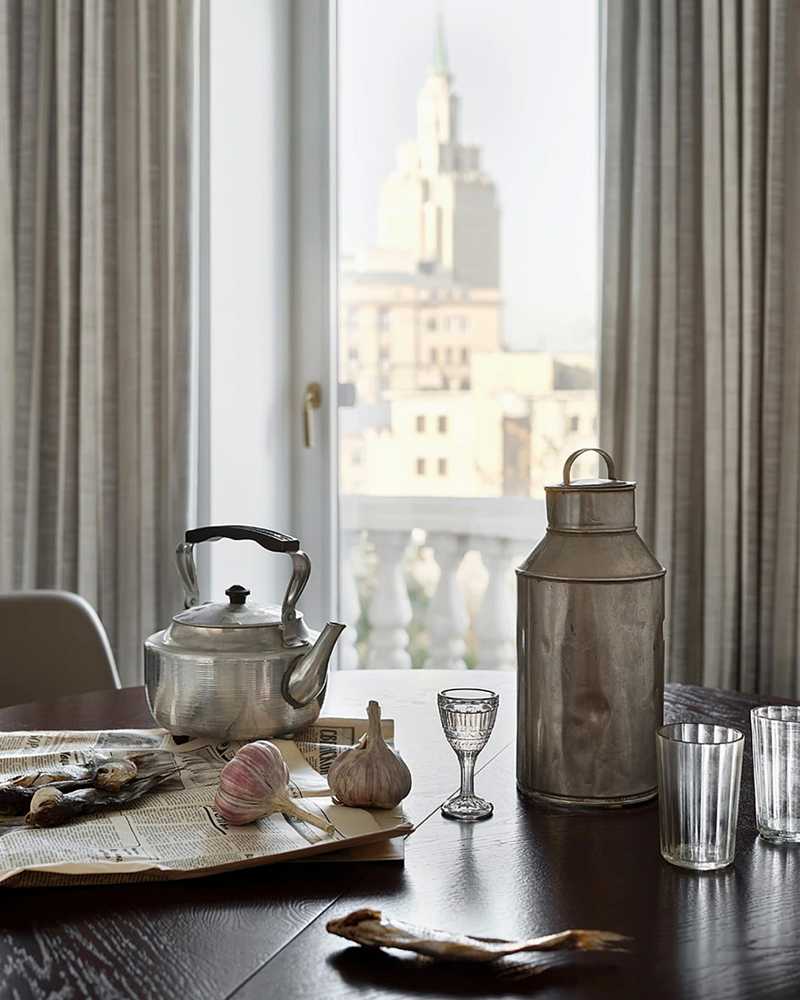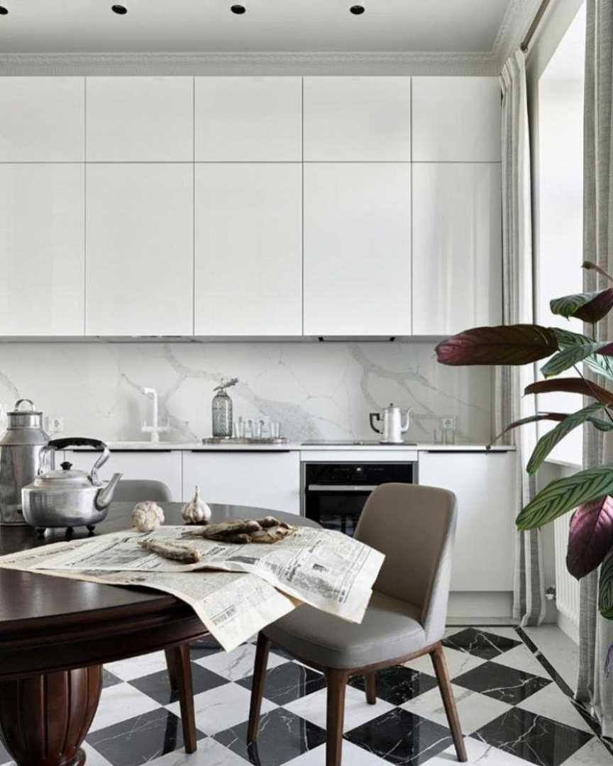 Кухонный гарнитур в современном стиле, но можно отметить мирное соседство ровных белых глянцевых фасадов с отреставрированной лепниной и гипсовыми розетками сталинской эпохи, французскими светильниками 1940-х годов. Обилие света, плавные линии, элегантный декор и спокойная палитра создают французское настроение в пространстве городской квартиры в центре Москвы.