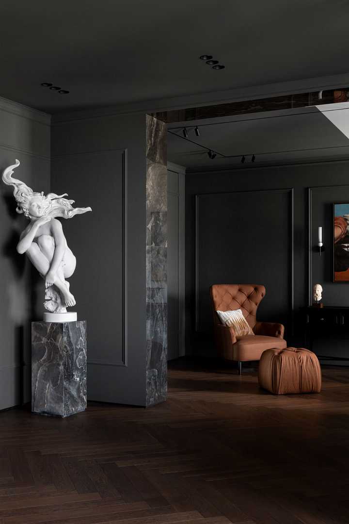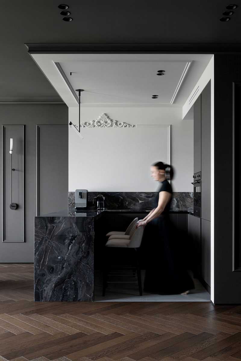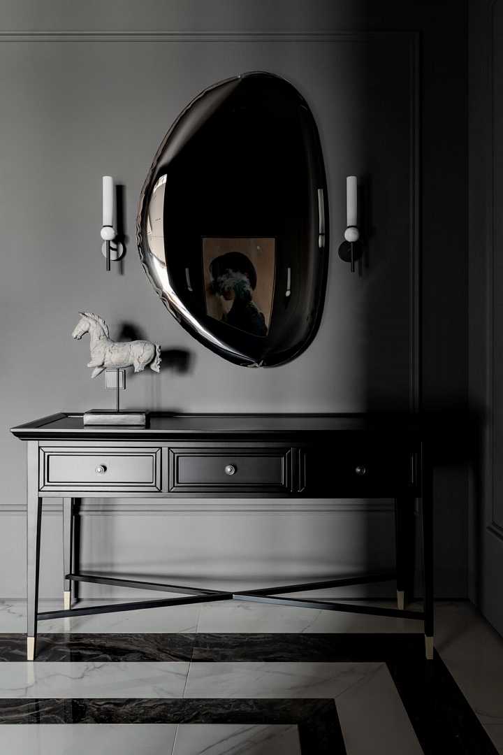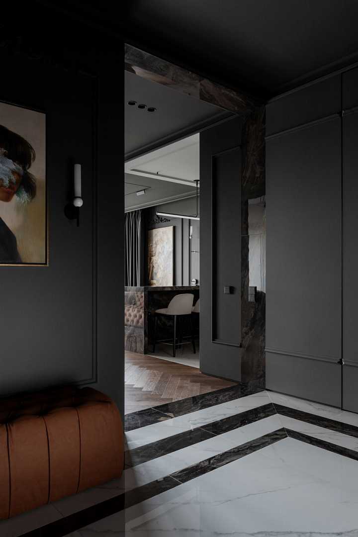 Войдя в квартиру, мы погружаемся в полумрак холла. Ковер из плитки под мрамор на полу показывает любовь заказчика к шахматам, а зеркало, искажающее отражение, погружает в загадочную атмосферу «Галереи теней» — так мы назвали наш проект. Пространство полностью открытое — дверей нет не только между холлом и кухней-гостиной, но и между общим пространством и спальней. Зоны мы контрастно разделили цветом и мраморными порталами, создающими эффект погружения. Часть квартиры темная, другая — светлая.
