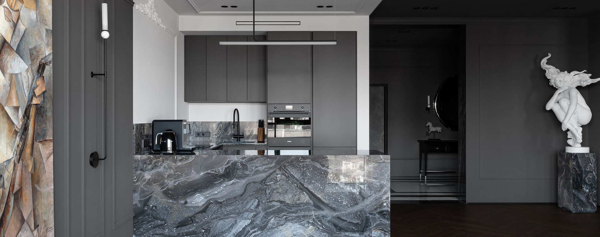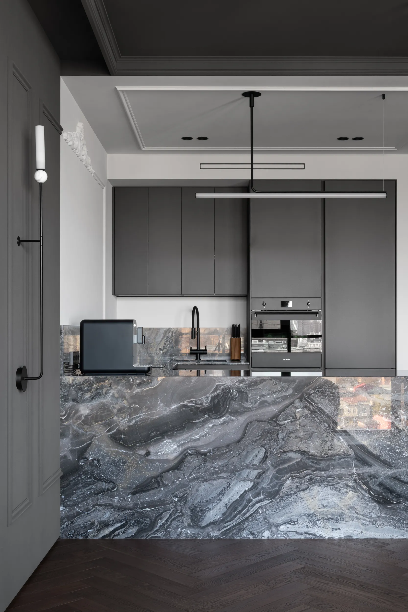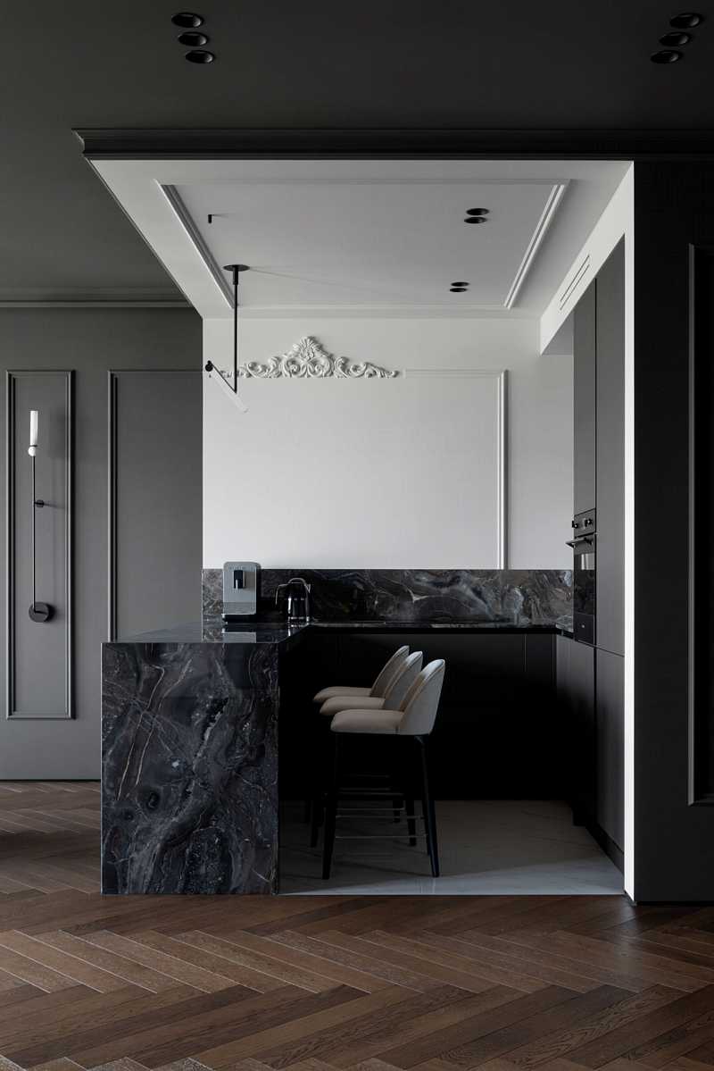 Войдя в квартиру, мы погружаемся в полумрак холла. Ковер из плитки под мрамор на полу показывает любовь заказчика к шахматам, а зеркало, искажающее отражение, погружает в загадочную атмосферу «Галереи теней» — так мы назвали наш проект. Пространство полностью открытое — дверей нет не только между холлом и кухней-гостиной, но и между общим пространством и спальней. Зоны мы контрастно разделили цветом и мраморными порталами, создающими эффект погружения. Часть квартиры темная, другая — светлая.