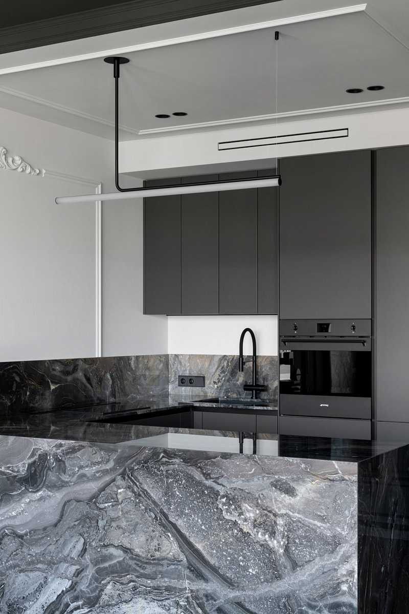 Белый цвет, мраморная столешница, изящный остров, лепнина — мы выделили эту зону кухни как арт-объект. Получилось лаконично, но довольно нестандартно. Интересно, что, несмотря на относительную монохромность и ограниченную палитру материалов, в каждой зоне все это воспринимается по-разному. Все благодаря ритму, контрастам, чередованиям и продуманным световым сценариям. Простые приемы золотого сечения помогли мне создать одновременно сложное и легкое пространство.