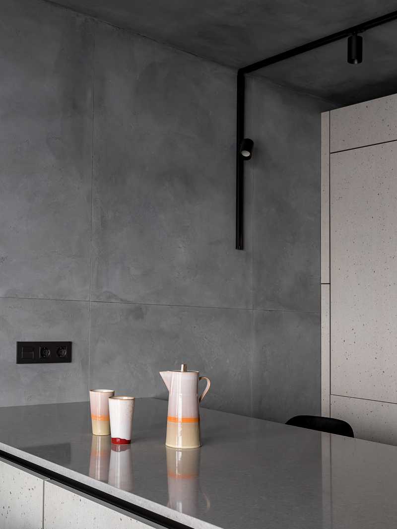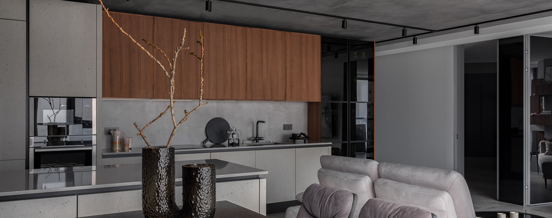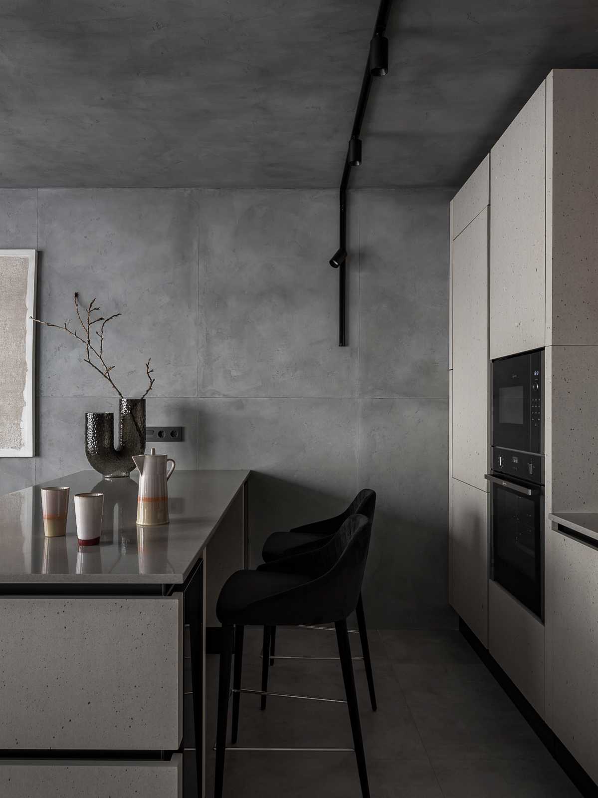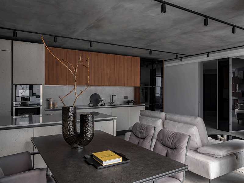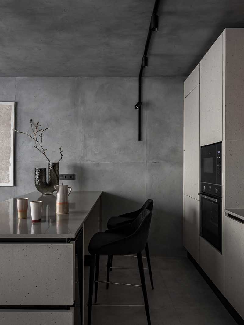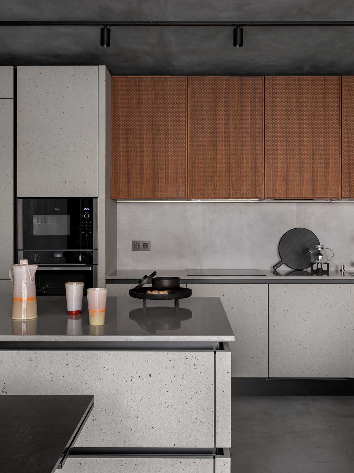 В отделке фасадов кухни, выполненных из натурального бетона, мелкие несовершенства лишь усиливают выразительность текстуры материала, а натуральный ореховый шпон с необычным тиснением добавляет пространству тепла.