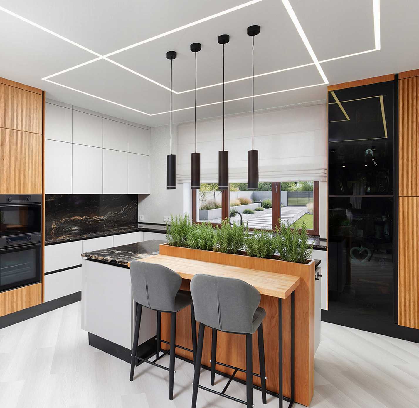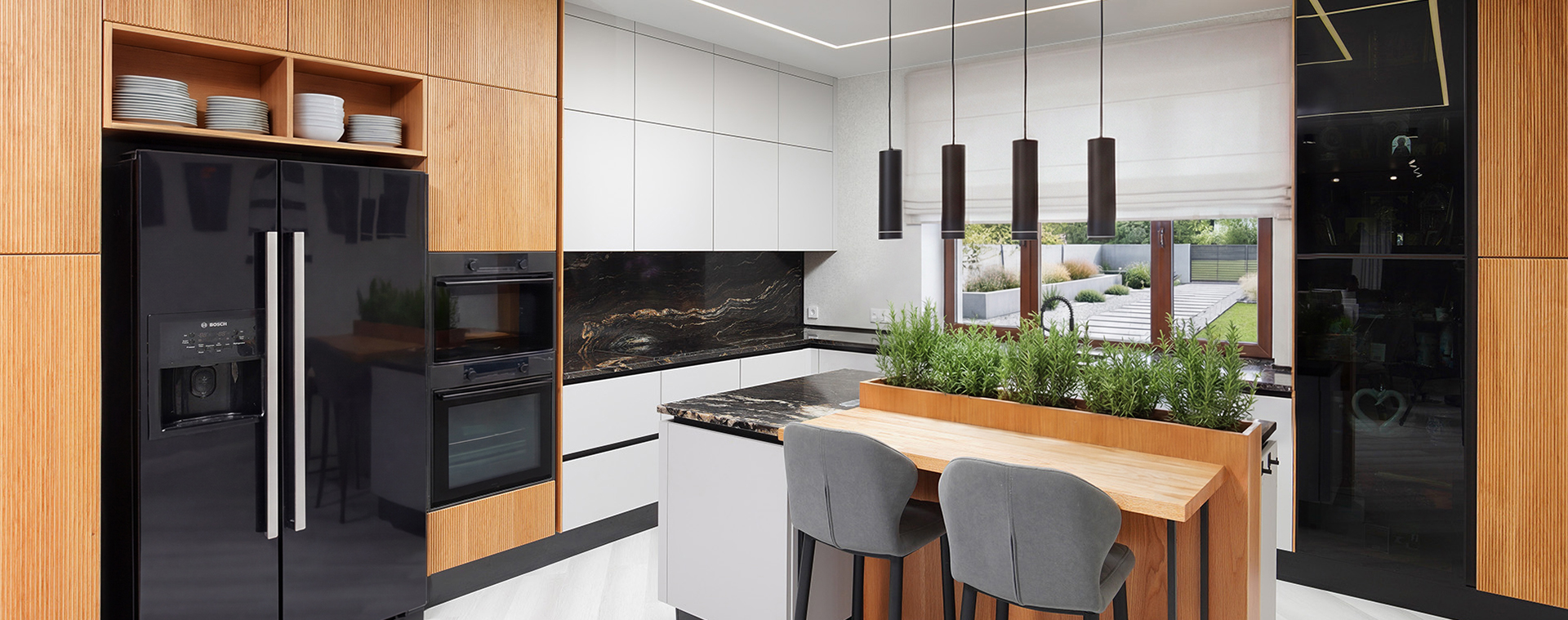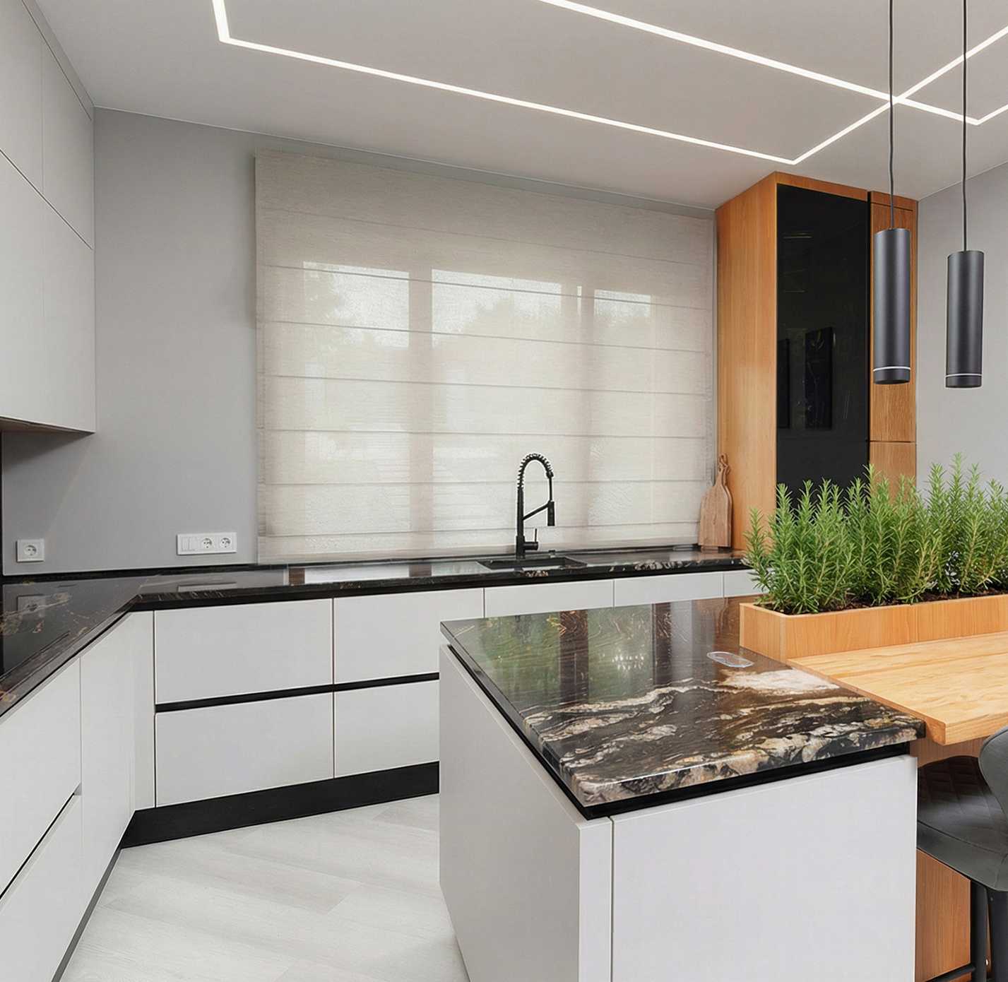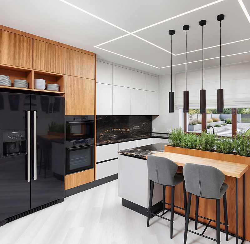 Натуральный дуб с его выразительной текстурой и тёплыми оттенками идеально подходит для кухни. Лаконичная фрезеровка на колоннах с техникой добавляет мебели элегантности и завершённости. Это придаёт интерьеру уют и ощущение домашнего тепла. Суперматовые светлые фасады в сочетании с дубом создают современный и сдержанный образ. В этом союзе натуральных материалов, современных технологий и хорошего дизайна каждая деталь создает комфортное и стильное пространство для жизни.