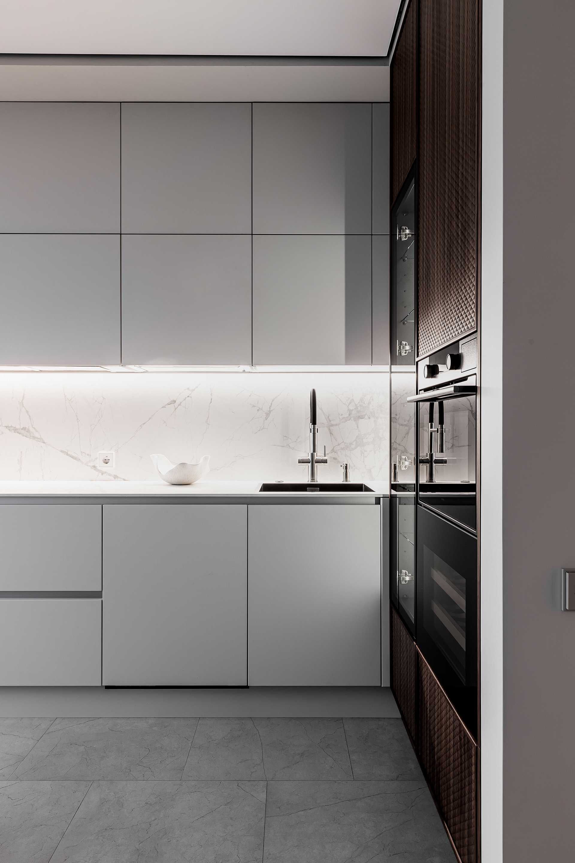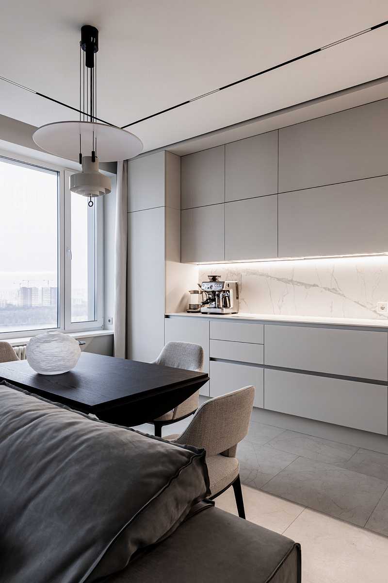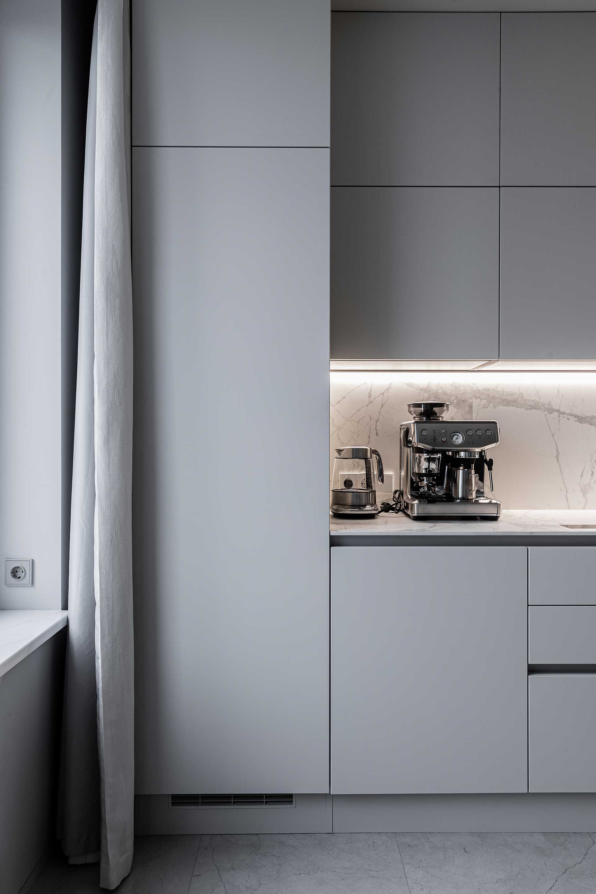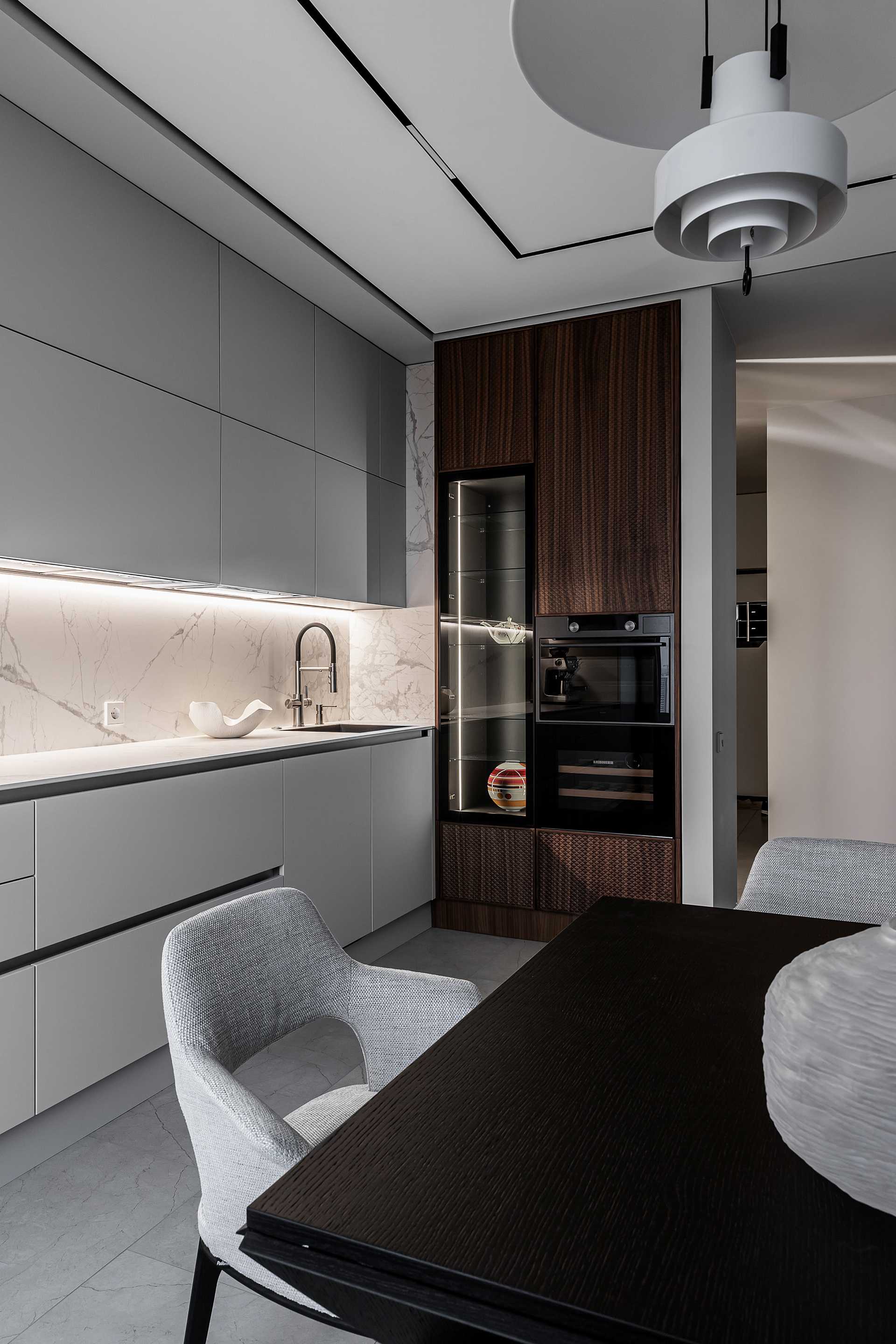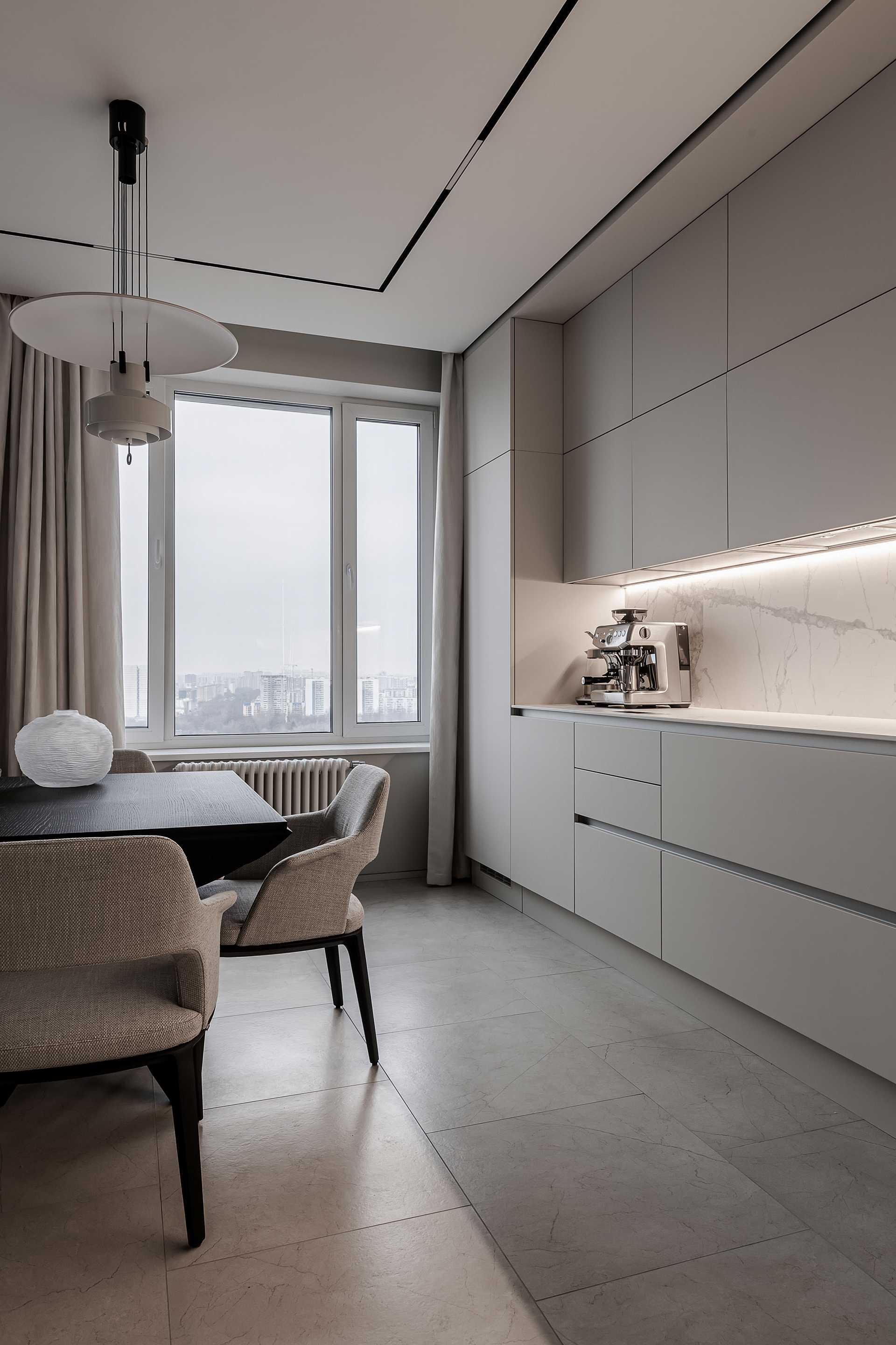 В этом проекте интерьер воплощает минимализм, сочетая функциональность и эстетику. Использование монохромной палитры позволяет подчеркнуть чистоту линий и выразительность текстур камня и дерева. Для отделки кухни выбрали сочетание матовой эмали LINEA и изысканного тисненого шпона ореха COUTURE, задающих тон всему пространству. Простая геометрия мебели в мягких нейтральных тонах создает ощущение свободы, пропуская много естественного света в комнату.