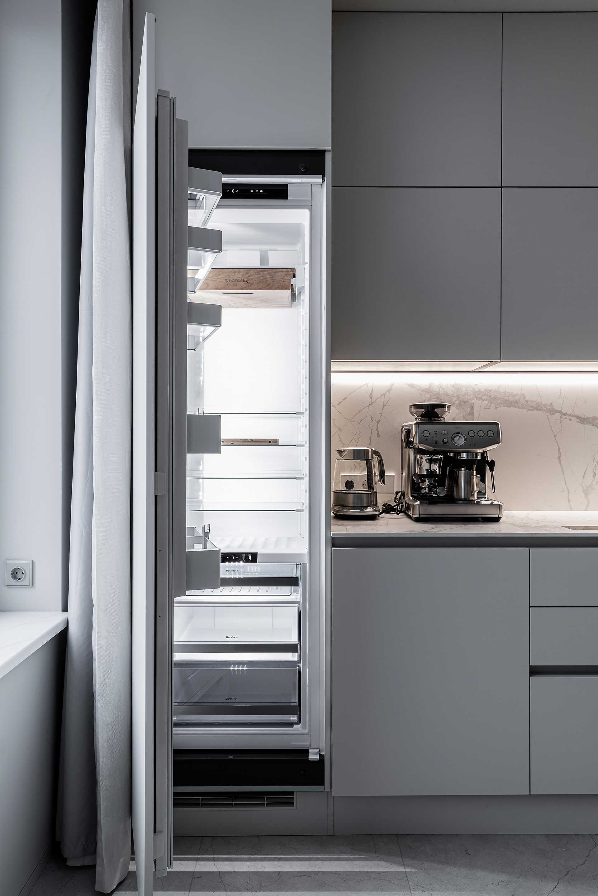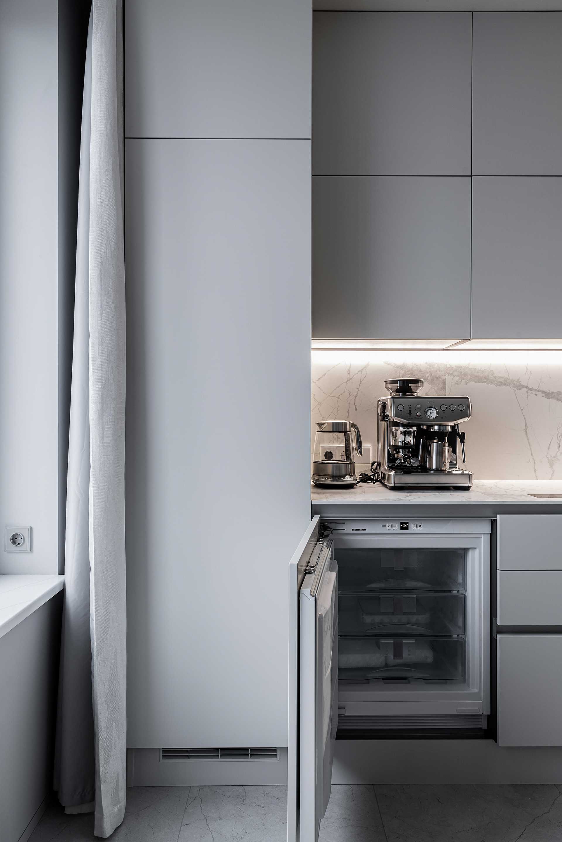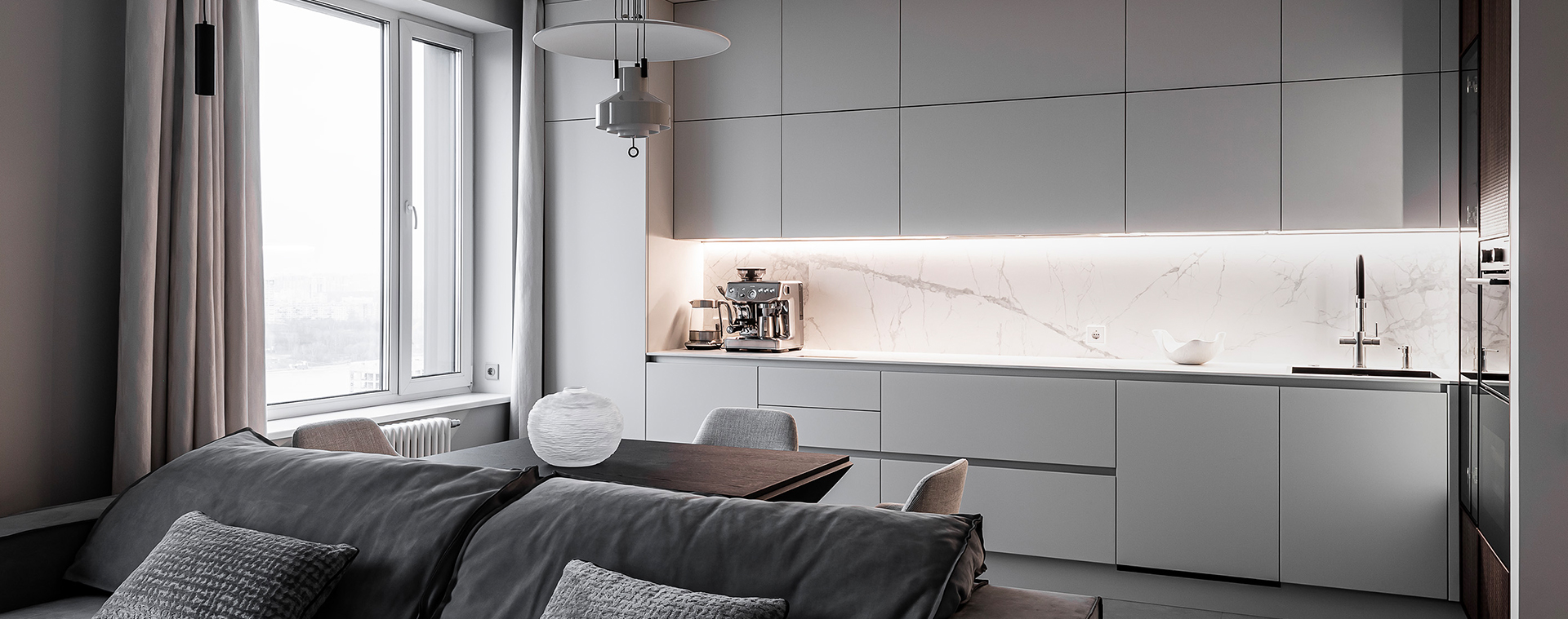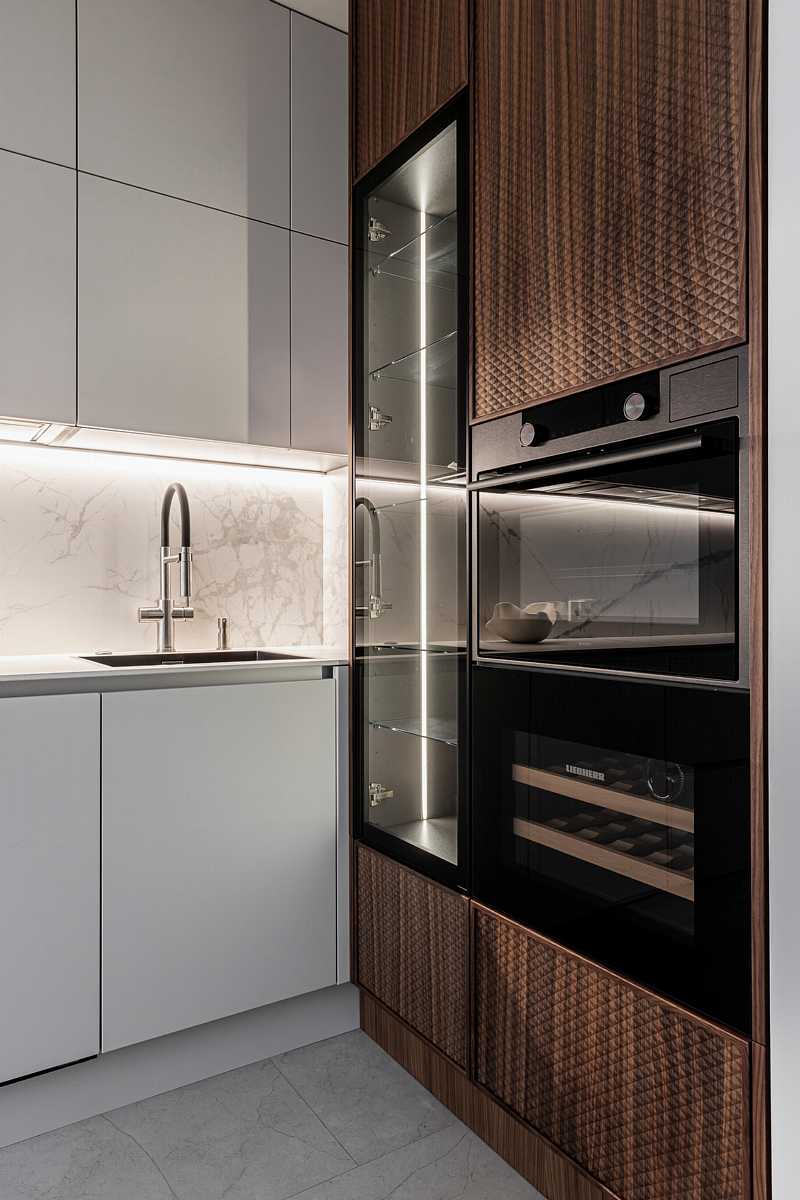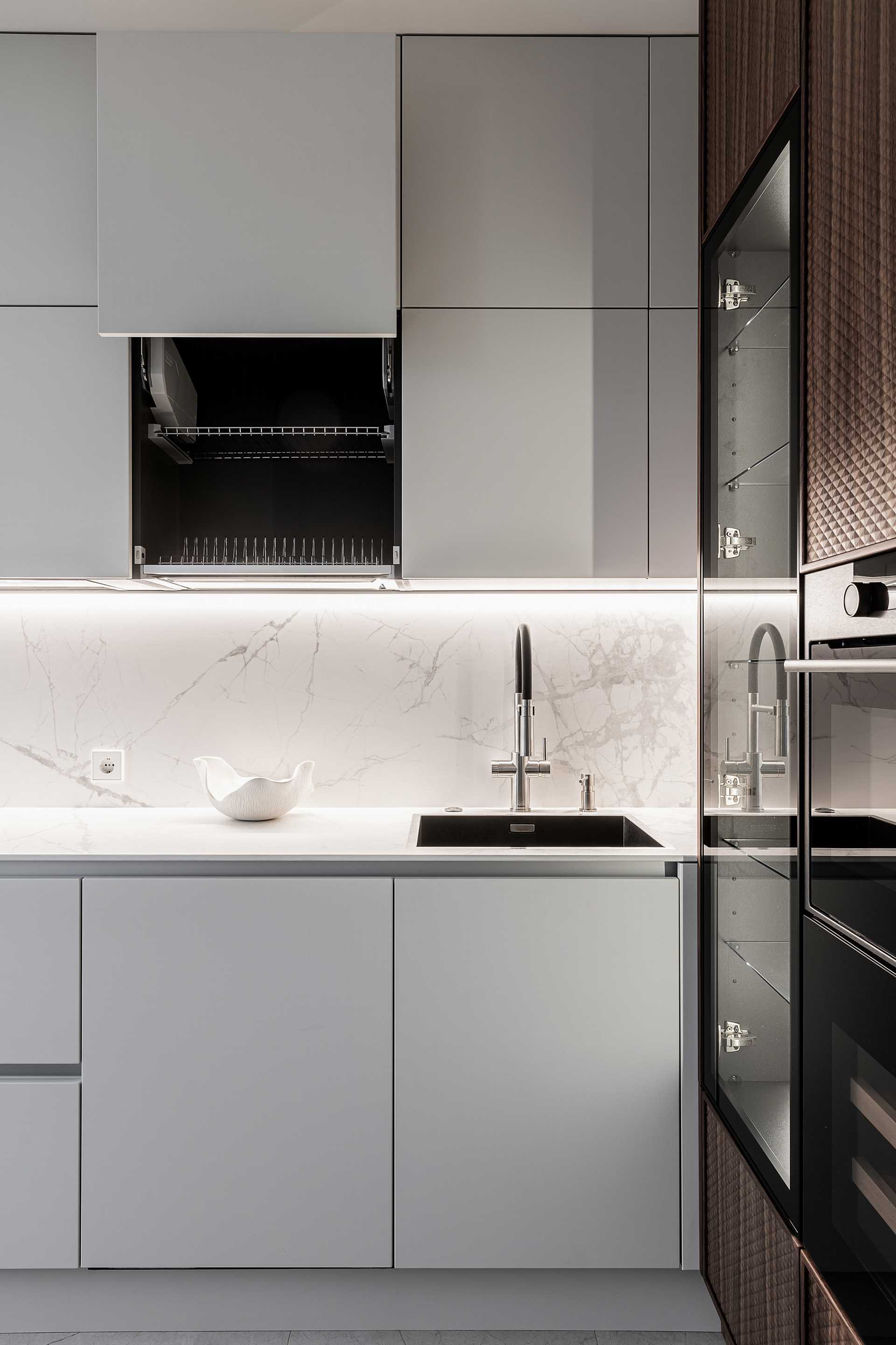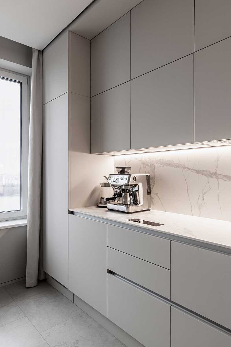 В этом проекте интерьер воплощает минимализм, сочетая функциональность и эстетику. Использование монохромной палитры позволяет подчеркнуть чистоту линий и выразительность текстур камня и дерева. Для отделки кухни выбрали сочетание матовой эмали LINEA и изысканного тисненого шпона ореха COUTURE, задающих тон всему пространству. Простая геометрия мебели в мягких нейтральных тонах создает ощущение свободы, пропуская много естественного света в комнату.